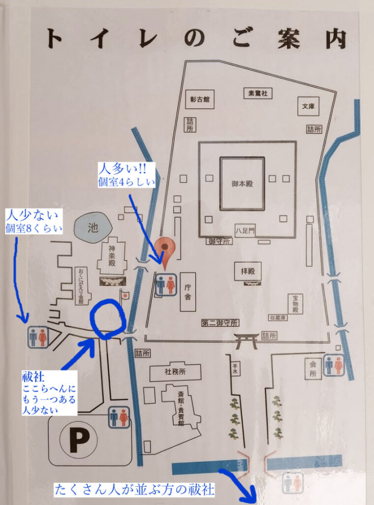 出雲大社のトイレマップに追記させてもらいました。御本殿近くの女子トイレは並んで時間がかかりますが、少し離れた箇所にあるトイレ(稲荷社近く)は個室の数も多いので、行列がさくさく進みます。男子トイレは混んでなかったと思います。